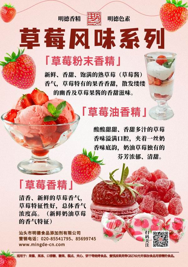 在草莓香精領(lǐng)域我們數(shù)十年潛心專研,迎合市場需求,滿足消費者喜好,汕頭市明德食品添加劑有限公司,推出了多種風(fēng)味的草莓香精,如:草莓醬風(fēng)味、奶油草莓風(fēng)味、新鮮草莓風(fēng)味、熟草莓風(fēng)味等。