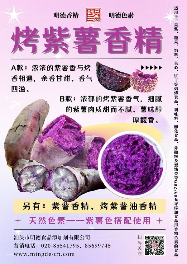 在薯味香精領(lǐng)域我們數(shù)十年潛心專研,迎合市場需求,滿足消費者喜好,汕頭市明德食品添加劑有限公司,推出了多種風味的薯香風味香精,如:紫薯香精、紅薯香精、烤紫薯香精、烤紅薯香精、甜紅薯香精等。